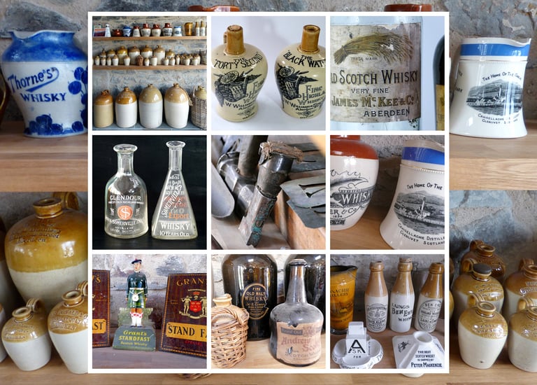 Items that have a connection with the many aspects of whisky manufacture and marketing – old bottles, tools, packaging, signs & advertising etc.